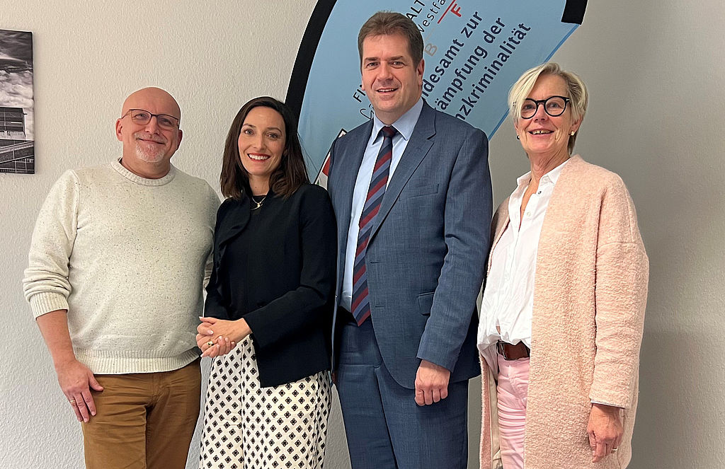 Die Behördenleiterin Stephanie Thien empfing zusammen mit ihrem Stellvertreter Michael Schneiderwind unseren Vorsitzenden Rik Steinheuer und Sabina Büttner, Leiterin Steuern und Soziales BdSt NRW. Das neue Landesamt hat 2024 die Arbeit aufgenommen und befindet sich im Aufbau. Es bündelt und vernetzt die besondere Expertise der Finanzverwaltung im Kampf gegen schwere Steuerstraftaten, Cybercrime und Geldwäsche. Komplexe Großverfahren werden im LBF NRW zentral koordiniert, das zudem die Funktion einer schlanken Schnittstelle zu Polizei und Justiz sowie Fahndungsbehörden in anderen Ländern, Staaten und auf EU-Ebene einnimmt.