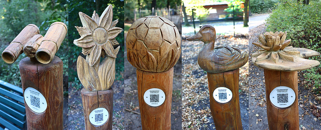Insgesamt 10 künstlerische Holzstelen säumen den Rundweg in der Jungfernheide