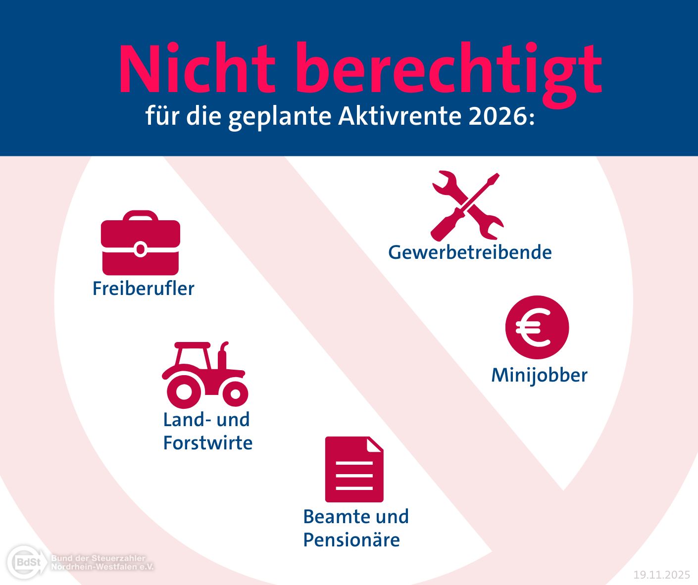 Ab Januar 2026 soll die Aktivrente starten. Das ist ein steuerfreier Zuverdienst für Rentner bis zu 2.000 Euro monatlich. Aber in NRW regt sich massiver Widerstand: Viele Steuerzahler melden sich verärgert beim BdSt NRW, etwa wegen der Ausschlüsse von Selbstständigen. Der BdSt NRW hält die Aktivrente in ihrer jetzigen Form grundsätzlich für nicht sinnvoll. Wenn sie kommt, muss sie zumindest gerecht, praktikabel und verfassungskonform ausgestaltet werden. Warum wir Musterverfahren unterstützen werden, erfahren Sie hier:
