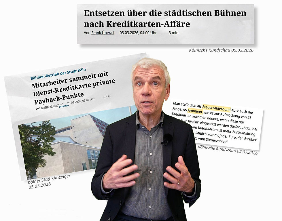 Die Nutzung dienstlicher Kreditkarten bei den städtischen Bühnen Köln sorgt für neue Kritik. Nach Medienberichten wurden bei Einkäufen über eine dienstliche Kreditkarte private Payback-Punkte gesammelt. Zudem bemängelt das Rechnungsprüfungsamt mehrere Unregelmäßigkeiten bei der Verwendung der Karten. Der Bund der Steuerzahler NRW hat sich dazu in Interviews mit Medien geäußert. BdSt-Experte Jens Ammann kritisiert den Umgang mit Steuergeld deutlich: